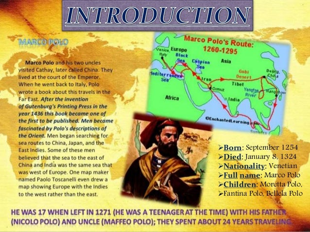 Polo was known for the book The Travels of Marco Polo, which describes his voyage to and experiences in Asia. Polo traveled extensively with his family, journeying from Europe to Asia from 1271 to. 1260-1295 Marco Polo Travels To Asia By santicodum1979 Follow Public Marco Polo contracted an illness and was forced to take refuge in the mountains of northern Afghanistan for an extended period of time. His father and uncle were merchants and both became very wealthy by trading goods in the Middle East. He traveled a lot with his family journeying from Europe to Asia from 1271 to 1295. Marco was seventeen when he took first journey to China with his father in 1271. In 1260 his father and his uncle, Nicolo and Maffeo Polo,set sail from. Marco Polo (/ ˈ m ɑːr k oʊ ˈ p oʊ l oʊ /, Venetian: ˈmaɾko ˈpolo, Italian: ˈmarko ˈpɔːlo; September 15, 1254 – January 8, 1324) was a Venetian merchant, explorer, and writer who travelled through Asia along the Silk Road between 1271 and 1295.